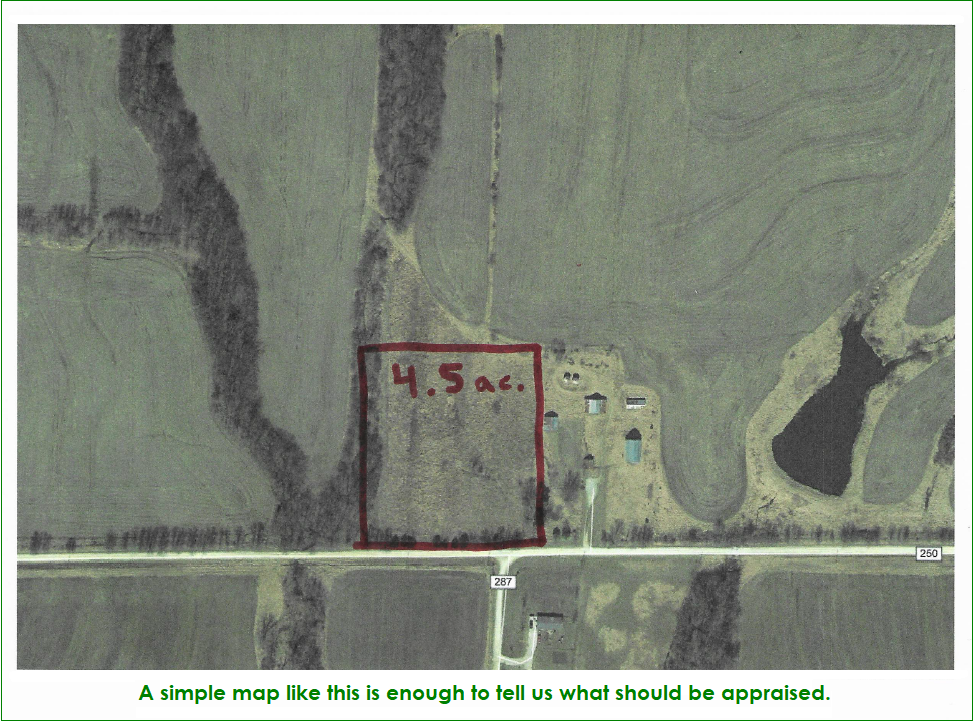 Very often, a client will need an appraisal on a proposed structure to be built on a piece of land split off from a larger property. Perhaps that is because the borrower is purchasing that smaller piece, or perhaps the lender does not want to include more land in the appraisal than is necessary. Whatever the reason, the appraiser needs to know how much land he is appraising and where it is, because real estate derives its value partially from its size, location, access to public roads, and maybe even soil types. For that reason, be sure to provide the appraiser with a survey of the site. If a survey is not being done, an aerial image with hand-drawn lines is better than nothing.