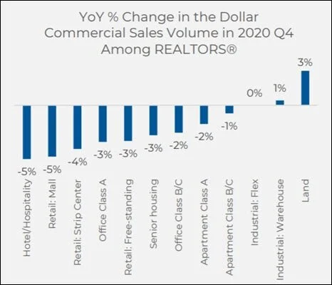 In the most recent NAR’s Commercial Real Estate Quarterly Market Survey at the end of 2020, Realtors reported that their sales transactions volume contracted in the fourth quarter. They reported the largest declines in sales volume in the hotel/hospitality market, retail malls, and retail strip centers. Industrial generally saw no negative change. The largest increase in sales was for land. Among land transactions, the largest gains in volume were for sales of recreational land, ranches, and residential land.