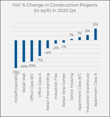 Trends in construction activity reflect similar demand levels across the sectors. Apartment and industrial saw the most increases in new construction.